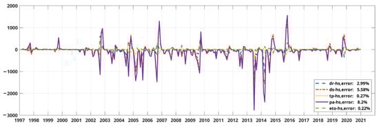 The joint temporal pattern behavior of all drought indicators in Figure 6 is similar to Figure 4. The maximum average error is obtained from pa with 8.2%, while the minimum one is obtained from eto with 0.22%. However, the error value fluctuates more than the other two fire indicators (ba and ce). The most error was obtained in 2013 and 2014. This result indicates that multiple factors influence hs occurrence and cannot be described by only one dominant mode in robust analysis. The example shows the resulting high negative error early to mid-year (Figure 6). Compared to ba and ce, hs has a much higher error in early to mid-year events. This behavior shows that hotspots occurred early to mid-year, while the dominant precipitation pattern is still in the wet season. Therefore, it cannot be captured by the joint pattern.