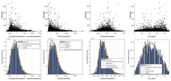 Scatter plot between hotspot and climate indicators (drought, total precipitation, evapotranspirartion, and dry spells) as well as climate indicators distribution.