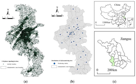 Distributions of mobile phone sign-in locations (a), and AQI monitoring stations (b) and the case site location (c).