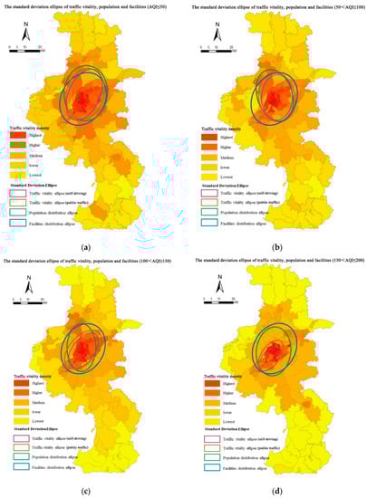Standard deviation ellipse (SDE) features of traffic vitality under different air quality levels (i.e., (a) AQI ≤ 50, (b) 50 < AQI ≤ 100, (c) 100 < AQI ≤ 150, and (d) 150 < AQI ≤ 200) in Nanjing.