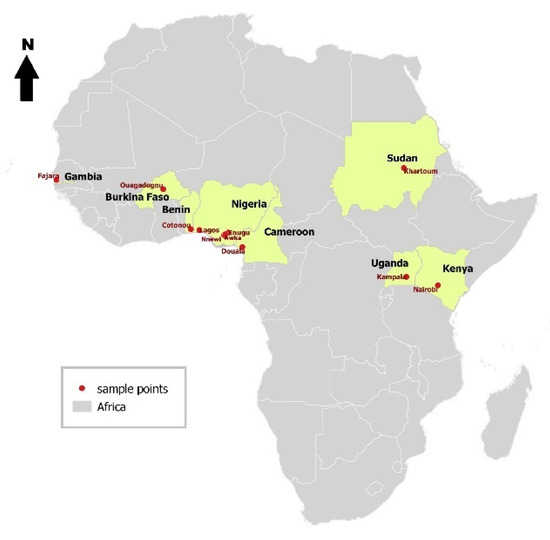 The study was conducted across 15 locations in eight sSA countries based on the location of the collaborating investigators, i.e., in West Africa—Benin Republic, Burkina Faso, Nigeria and The Gambia; Cameroun in Central Africa, Sudan in North-Eastern Africa—and in East Africa—Kenya and Uganda (Figure 2).