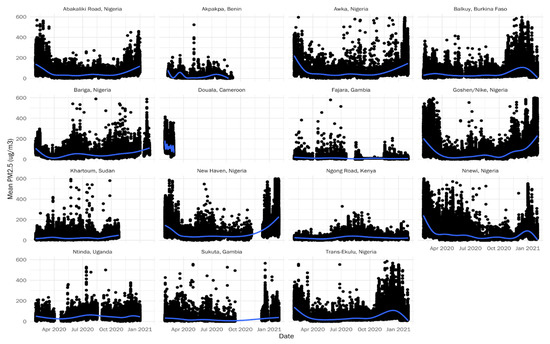 The annual averages measured in our study using a network of low-cost sensors (10–116 µg/m3) are consistent with those reported in previous studies in sub-Saharan African cities using limited numbers of high-cost sensors in ground monitoring station networks and BAM-calibrated low-cost sensors in one study [28,29,30,31]. Katoto et al. reported in their systematic review on ambient air pollution and health in Africa that utilising high-cost sensors, the annual PM2.5 concentrations in Cameroon, Kenya, Madagascar, Mauritius, Nigeria, Senegal, South Africa, Uganda, and Tanzania were found to be between 19 µg/m3 and 170 µg/m3 [29]. Furthermore, three East African countries (Uganda, Ethiopia, Kenya) were evaluated and found to have urban ambient air pollution annual averages above the WHO limits, with Kampala having the highest values −55.7 ± 20.3 µg/m3 (100% above the WHO limits) [31]. In another review of eight studies of ambient air pollution in African cities (covering seven countries: Algeria, Egypt, Ethiopia, Mali, Morocco, Nigeria & Zimbabwe), PM2.5 concentrations varied between 40 and 260 µg/m3 [32], compared to an annual average of 13 µg/m3 in urban Europe [33] and 9 µg/m3 in urban United States [34] in 2019.