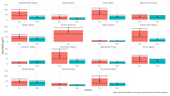 Seasonal variation was less pronounced in some of our study sites except in Benin, Kenya, Uganda, The Gambia (Sukuta) and seven sites in Nigeria that recorded higher pollutant levels in dry season compared to wet season. It is however noteworthy that in spite of this, African countries and other LMICs record more noticeable seasonal variation than high-income countries [35]. As in our study, higher PM2.5 concentrations have also been reported in the dry season compared to the wet or rainy season by other studies [25,36,37]. This is likely due to a direct effect of rain during the wet season. Another possible explanation is PM2.5 being blown by wind during the dry season, with the dry season also having higher wind speeds and gusty winds compared with the wet season [38].
