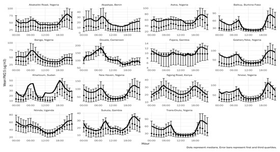 Our study represents a unique collection of recent longitudinal ambient PM2.5 data collected in 15 sites across eight sSA countries using low-cost sensors. The main result shows that ambient air pollution was high in all study sites, the mean PM2.5 being way above the WHO recommended maximum annual average of 5 µg/m3. Fajara, The Gambia had the lowest-(10 µg/m3) while Douala, Cameroon had the highest period average of 116 µg/m3, although this was based on a limited dataset. Of the sites with complete data, New Haven (Enugu, Nigeria) had the highest fine particulate annual average. There was a tendency towards high ambient PM2.5 levels during the dry season in Nigeria, Uganda, and Cameroon. Importantly, a diurnal variation of the ambient air pollution was observed in all sites with two daily peaks at about 06:00 and 18:00 local time.