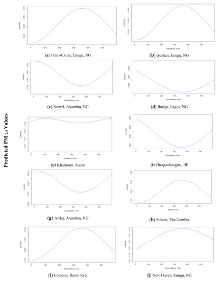Seven sites in Nigeria showed marked seasonal variation in PM2.5 levels between dry and wet season (Figure 4). Beninese, Ugandan, Gambian (Sukuta) and Kenyan sites also showed slight seasonal variations. Furthermore, mean circadian variations showed peaks generally observed early in the morning (06:00 to 08:00) and later in the evening (19:00 onwards—Figure 5). Harmonic regression confirmed this trend by showing that at most sites, there were twice-daily PM2.5 cycles in the mornings and the evenings (Figure 6). Autocorrelation models also showed that all dependents between data points were captured (Appendix A).