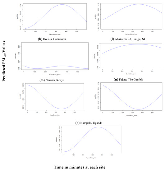 Harmonic regression tracings for each study site. Harmonic regression plots showing the temporal changes in PM2.5 pollution spikes and throughs at all sampling sites (a–o). X-axis bears the time in minutes while the Y-axis shows the predicted PM2.5 values.