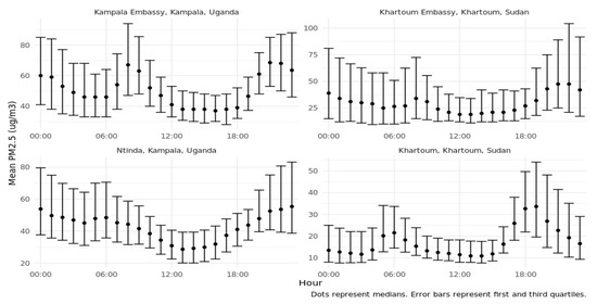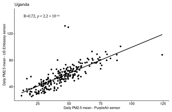 The PM2.5 data from the PurpleAir-II-SD devices in Kampala (Uganda) and Khartoum (Sudan) were also compared to the freely available MET One Beta Attenuated Monitor (BAM-1020) readings, reported by the USA embassies in these cities through the AirNow® initiative [25,26,27].
