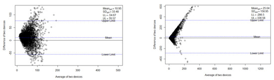 Bland–Altman test of agreement plot between US MET One BAM and MA3 PurpleAir Device in Kampala, Uganda (left) and in Khartoum, Sudan (right).