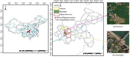 Location in Chongqing and distribution of meteorological stations: (a) Hechuan meteorological station; (b) Shapingba meteorological station.