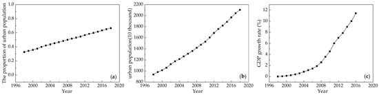 (a) The proportion of urban population in Chongqing; (b) urban population in Chongqing; (c) GDP growth rate from 1998 to 2016 (source: Chongqing Statistical Yearbook). Data for each year are indicated with black dots.