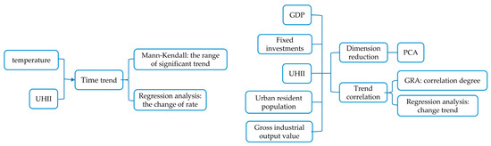 The interannual and seasonal variation trends in temperatures (slopes) are calculated using the least-squares method. The Mann–Kendall test is used to determine the year in which this trend becomes statistically significant. The magnitude of the UHI effect can be expressed in terms of urban heat island intensity (UHII), which is the temperature difference between urban and rural areas in this paper. The grey relational analysis and the principal component analysis investigate the relationship between UHI and urbanization development. These methods are described in detail as follows: