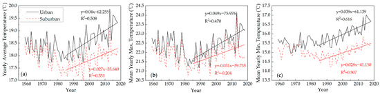 Temperature for urban and rural areas, 1959–2018: (a) yearly average temperature; (b) mean annual daily maximum temperature; (c) mean annual daily minimum temperature.