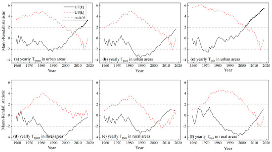 The Mann–Kendall statistic curves during the period of 1959–2018: (a) mean yearly temperature in urban areas; (b) mean yearly temperature in rural areas; (c) mean annual daily maximum temperature in urban areas; (d) mean annual daily maximum temperature in rural areas; (e) mean annual daily minimum temperature in urban areas; (f) mean annual daily minimum temperature in rural areas, and the period where the tendency is statistically significant UF(k) values higher than the limit of 1.96 at the significance level α = 0.05 indicated with black dots.