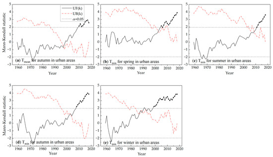 The Mann–Kendall statistic curves during the period of 1959–2018: (a) mean temperature for autumn in urban areas; (b) mean daily minimum temperature for spring in urban areas; (c) mean daily minimum temperature for summer in urban areas; (d) mean daily minimum temperature for autumn in urban areas; (e) mean daily minimum temperature for winter in urban areas.