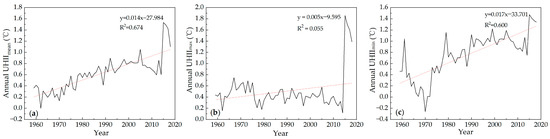 The interannual variation and trend, 1959–2018: (a) UHIImean; (b) UHIImax; (c) UHIImin.
