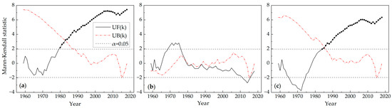 The Mann–Kendall statistic curves during the period of 1959–2018: (a) the annual UHIImean; (b) the annual UHIImax; (c) the annual UHIImin.