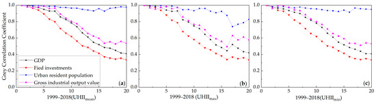 GRA of between the urbanization factors and UHII in Chongqing: (a) UHIImean; (b) UHIImax; (c) UHIImin.
