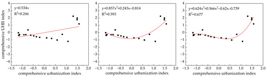 UHII is mainly related to weather conditions and urban morphology. Many studies showed the influence of weather conditions on UHII; it is higher in calm and clear weather, while lower or even disappears in cloudy and windy weather [61]. UHII is inversely proportional to cloud cover and wind speed [62,63]. However, this paper mainly studies the correlation between UHII and urbanization factors. Four indicators closely related to urbanization development and UHII are selected for PCA to form a comprehensive urbanization index and a comprehensive UHII index. The relationship between Urbanization Factors and UHII is analyzed; as shown in Figure 11, UHII in Chongqing is currently in a phase of rapid increase with urbanization factors. In the meantime, UHII reached a coordinated development stage in northwest China where it has declined with urbanization. However, the UHII in Chongqing has not yet reached its peak. Therefore, in Chongqing, we cannot assume for now that the UHI effect will be solved naturally with urban development; policy guidance and social intervention are very necessary.