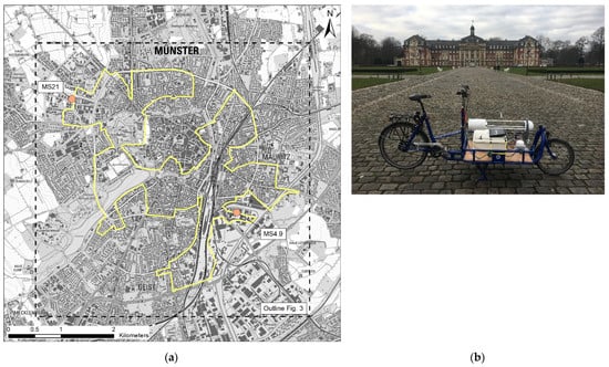 (a) City route for mobile measurements (MM) and location of stationary measuring stations MS21 and MS4.9: Map source: DTK25, 1:25,000, © Geobasis NRW 2017, DL-DE->Zero-2.0, (http://www.govdata.de/dl-de/zero-2-0, accessed on 1 November 2021). URL: https://www.bezreg-koeln.nrw.de/brk_internet/geobasis/topographische_karten/aktuell/25000/index.html (accessed on 1 November 2021); (b) Mobile station setup MM with CH4 sensor (1), GPS receiver (2), display (3) and logger box including battery (4).