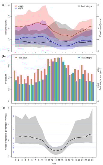 (a) Diurnal cycle of background mixing ratios at MS21 (BMS21) and MS4.9 (BMS4.9), and peak integral at MS4.9; lines represent median; shadows represent range between 25% quantile and 75% quantile; (b) Diurnal cycle of peak count and peak integral sum at MS4.9; (c) Diurnal cycle of the vertical temperature gradient; lines represent median, shadows represent range between 25% quantile and 75% quantile; blue: classification after Pasquill [38].