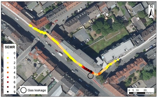 Coordinating and supplementing a measurement strategy with the infrastructure operator can improve or refine results. By using appropriate gas network plans, the mobile measurement setup used in the present work could prove to be useful when the gas network is undergoing review: The gas network is regularly checked by the operator according to worksheet DVGW G 465 [59] by checking the air directly above the ground surface for combustible gas using a handheld measuring device (carpet or bell probe). The check is carried out annually for high-pressure lines and every four years for low-pressure lines [55]. Because the MM can provide a large spatial coverage in a short time and because it has a high success rate in detecting point sources, the mobile measurement platform may become a suitable supplement to survey operations.
