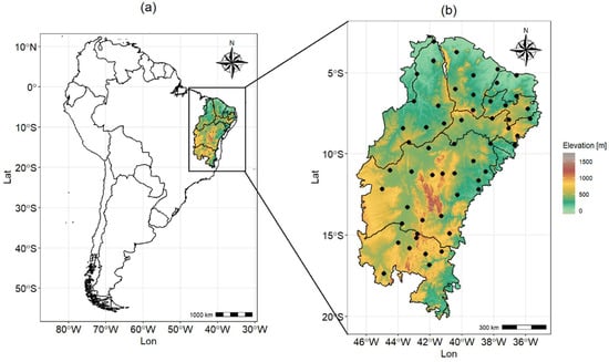 (a) Limits of South America and Brazil. (b) Limits of the Brazilian semiarid region and its topography with the geographic location of the rain gauges used in the study.