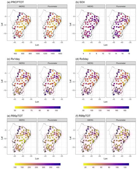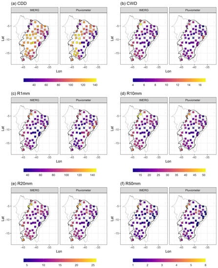 The values of the extreme indices from the IMERG and rain gauges are shown in Figure 2 and Figure 3. In general, the indices calculated with the IMERG data were similar to those calculated with the rain gauge data. The PRCPTOT (Figure 2b) shows marked variability, with regions (west edge) reaching values above 1600 mm/year, while, in the drier areas of the SAB, the precipitation reached values between 400 and 500 mm/year. IMERG was able to satisfactorily represent the spatial distribution of total precipitation, although slight underestimation was observed in the northern portion and on the eastern coast. For the SDII index, similar values were obtained (IMERG and pluviometer) for most of the SAB. The exception was the eastern SAB region, where the values calculated from the IMERG data were higher than those calculated from the rain gauge data (Figure 2b). The same occurred for the other intensity indices (Figure 2b–f). In most of the SAB, the indices calculated from the IMERG data and rain gauges were similar, with the greatest differences being observed in the eastern part of the study area. Similar results were reported by [] when evaluating IMERG daily precipitation data in the eastern portion of the São Francisco River Basin. The authors stated that the low performance of the product may be associated with the predominant cloud type in the region.