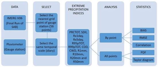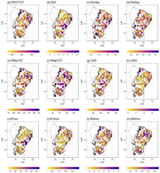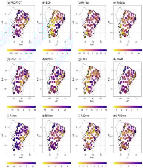 The indices of the Expert Team on Climate Change Detection and Indices (ETCCDI) are based on daily temperature and precipitation. In this study, only indices based on precipitation were used, totaling 12 (Table 1). The reason for choosing these 12 indices was the fact that precipitation is a very important climate element in the SAB for the short, medium, and long term, in addition to being typically used to represent the probability of rare events [,].