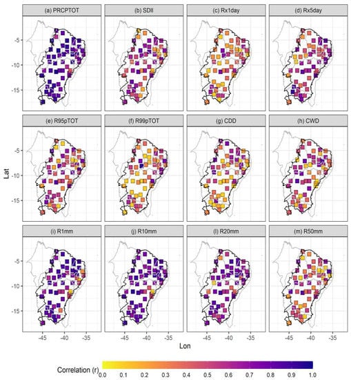 Spearman correlation coefficient (r) between climate indices derived from IMERG and rain gauges over a period of 21 years (2000–2020), (a) PRCPTPT, (b) SDII, (c) Rx1day. (d) Rx5day, (e) R95pTOT, (f) R99pTOT, (g) CDD, (h) CWD, (i) R1mm, (j) R10mm, (l) R20mm, (m) R50mm.