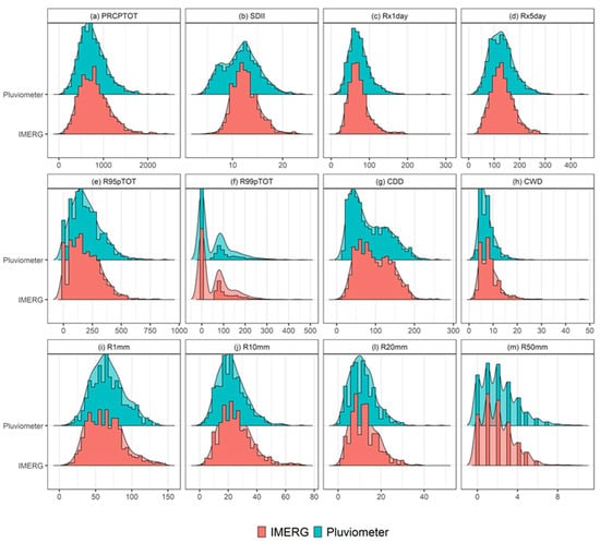 PDF of the climatic indices for the 56 points of comparison between IMERG and rain gauges. The histograms represent the empirical distribution. The curves represent the density estimated using the kernel method, (a) PRCPTPT, (b) SDII, (c) Rx1day. (d) Rx5day, (e) R95pTOT, (f) R99pTOT, (g) CDD, (h) CWD, (i) R1mm, (j) R10mm, (l) R20mm, (m) R50mm.