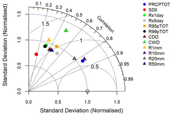 Statistical comparison between climate indices from the Taylor diagram. RMSE is represented with curved lines in gray, STD is represented with curved lines in blue, and r is represented with straight lines in black.
