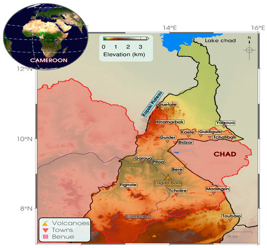 The Sudano-Sahelian region lies between 7° N and 13° N longitude and 11.5° E and 16° E latitude (Figure 1). It is a relatively flat topography. It has a drainage area of about 100,000 km2 with a population of about 5,530,643 inhabitants. It is located in the north of Cameroon and covers two administrative regions (the far north and north). The Sudano-Sahelian region has geostrategic importance as a source of water resources, a potential for hydropower, and is favorable to the livestock and growth of cotton, millet, sorghum, maize, rice, groundnuts, and onions. All of these crops are supervised by major companies, such as “Société de Développement du Coton (SODECOTON)” and “Société d’Expansion et de Modernisation de la Riziculture dans la ville de Yagoua (SEMRY)”. The climate of the study area can be broadly divided into two: the Sahelian and Sudanian zone located northward and southward of 9° N, respectively. Generally, the climate is under the influence of the thermodynamic properties of the African Monsoon, which brings rain between June and September in the Sahelian zone and May and October in the Sudanian zone. The annual rainfall increases from the north toward the south between 328 and 1670 mm. This area is under the strong influence of humidity advected from the Atlantic Ocean and from southwesterly [30]. The daily temperatures are usually between 25 and 34 °C.