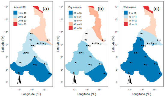 Spatial map of the mean value of (a) the annual precipitation concentration index (PCI), (b) dry season PCIdry, and (c) rainy season PCIwet in the Sudano-Sahelian region of Cameroon.
