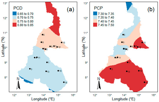 Figure 3a,b illustrate the spatial distributions of PCD and PCP values, respectively, over the study area from 1980 to 2018. PCD values ranged from a minimum of 0.65 in the south-eastern part to a maximum of 0.85 in the far north of Cameroon. Most of the climate stations in the Sudano Sahelian region have also exhibited a non-significant increasing trend at the 90% level of PCD, although the slope trend varies between 0.0001/year at Tchollire and Tchatibali in the southern part and 0.0025/year at Guetale in the far north (Table 4). These results indicate that the annual rainy days in a year decreased from the south to the far north, implying a higher probability of flood events in a year toward the far north than in other parts of the Sudano-Sahelian region of Cameroon (Figure 3a).