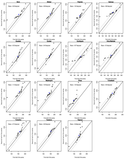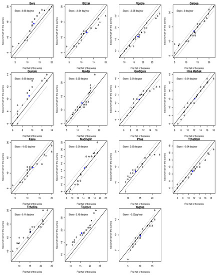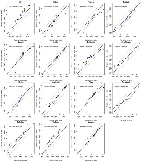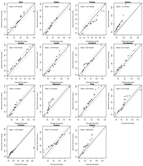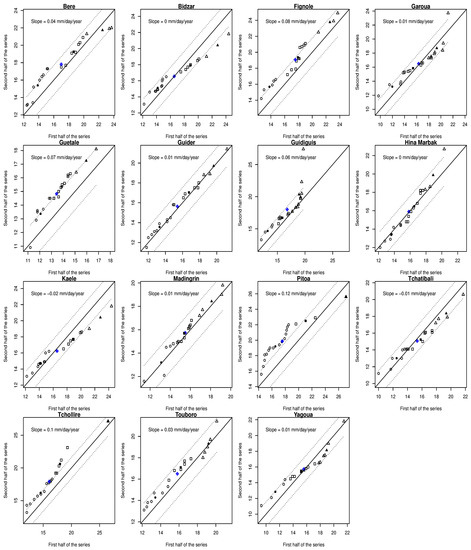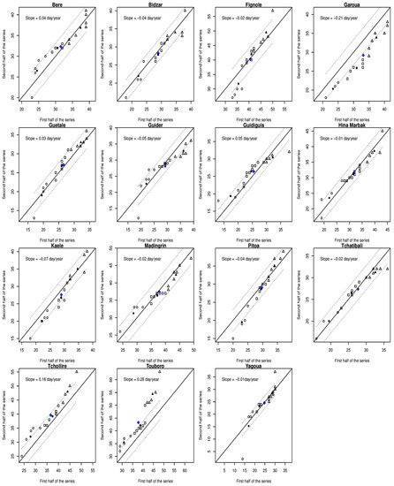 Few stations had missing values, i.e., fewer than 4% (Table 1). Homogeneity results show that 73.33% of stations were labeled as “useful”, as shown in Table 3. Fignole, Guetale, Hina-Marbak, and Touboro stations were classified as “doubtful”. After the homogeneity assessment, data from 15 stations should be used for the analysis of trends and variability.