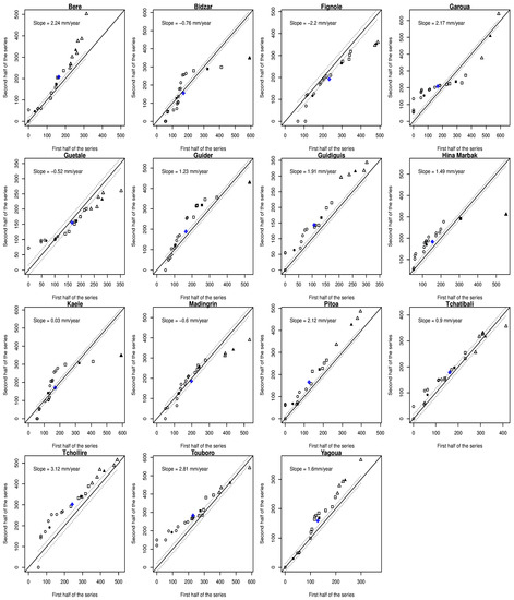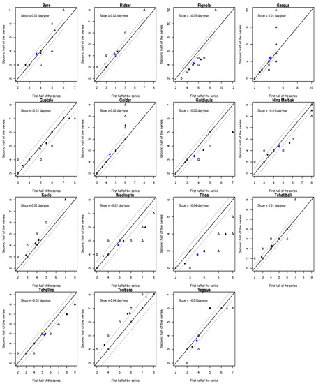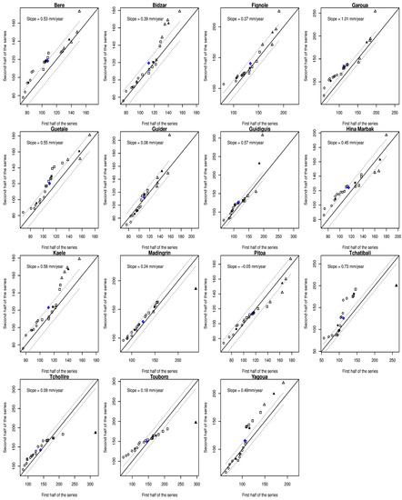 Results are almost consistent with the results obtained in previous studies at the regional level in West Africa [10,20], Central Africa [48], in the Sahelian region [19,49], and in some nearby areas (for example, Nigeria) [50]. However, the highlights and innovations of this study identified trends of low, medium, and high values of extreme precipitation in the last forty years; moreover, we compared the monotonic trends in the Sudano-Sahelian zones.