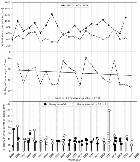 It is also well-known how total annual precipitation at SdG presents a strong inter-annual variability [14]. Figure 3a shows the total accumulated rain and snow per hydrological year, defined from 1 October to 30 September. Average rain precipitation is around 800 mm per year, with some years over 1000 mm year−¹ such as 2007, 2016 and 2020. Regarding snow precipitation, the average is around 500 mm per year and the highest values were reached in 2004, 2013 and 2018. It is remarkable that the variability in the time series of rain and snow is not always coupled and there are no discernible trends during the period of study. Nevertheless, if we focus on the number of days with snowpack higher than 5 cm Figure 3b), using a Theil-Sen regression in combination with a Mann–Kendall test for the statistical significance, a downward trend of 0.5 days per year with a confidence level of 84% is found. This reduction of seasonal snow cover is quite relevant for the region, as snow acts as a natural reservoir to store water. The main hypothesis is that this trend could be related to an elevation of the zero degrees Celsius isotherm due to climate change, as pointed out by other studies for this region using different bioindicators [43,44,45,46].