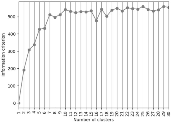 For selecting the optimum number of CWTs, we use an information criterion (IC) or cost function, like those applied in previous studies [15,22,37]. This criterion, formulated as Equation (1), is based on any local precipitation at SdG, for which daily precipitation data of Navacerrada observatory are used. This function calculates, for a certain number of CWTs, the difference between the number of wet days for each CWT and the expected number considering the probability of wet days for all the population and the number of days of each cluster. It compares how far each CWT is from average behaviour. Since, this difference is computed no matter the sign, drier and wetter days compute in the same direction. If for a certain number of CWTs we have a high score, this means that days are separated into groups that are drier or wetter than average. If the score is low, it means that the method is clustering using distances that are not related to the variable used in the calculation of the score function. Higher values of this score, in our case, would mean that there is a connection between large-scale synoptic configuration (distances) and local precipitation at SdG.