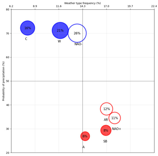 Most of the information provided in Table 3 is also displayed graphically in Figure 6, helping the reader to assess the results. This figure clearly reflects how good the K-means method is separating wet from dry days. The frequency of occurrence of each CWT is represented on the x-axis while the probability of precipitation is depicted on the y-axis. Thus, the upper left corner (C) represents the least frequent CWT but with the highest probability of precipitation while the lower right corner contains the most frequent but the driest CWTs (A, SB and NAO+). The contribution of each CWT to the total precipitation is also shown by the size of each circle, being the NAO- the largest contributor. Blue and red colours are used to represent the ‘humid’ and ‘dry’ CWTs, as their PoP is above 70% and below 39%, respectively. The unfilled circles (AR, NAO- and NAO+) represent the CWTs with a probability of precipitation as snow higher than 50%. As pointed out before, a minimum of 0,5 mm day−¹ has been considered for defining a day with precipitation either snow or rain, so, the different probabilities have been calculated accordingly.