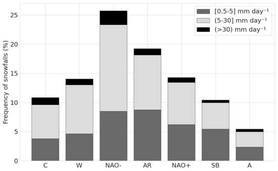 An analysis of snowfalls according to their CWT and their daily intensity (grouped in the intervals [0.5–5] mm day−¹, (5–30] mm day−¹ and >30 mm day−¹) was also performed and it was found that in absolute terms NAO- was the most common CWT for moderate and extreme snowfalls while in relative terms, C was the CWT with a higher proportion of extreme snowfalls.