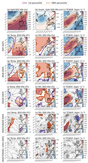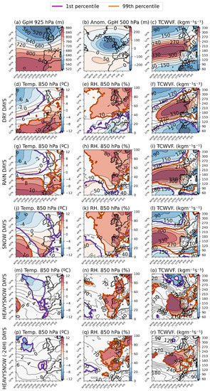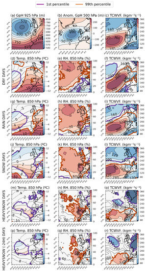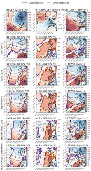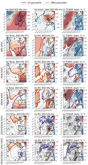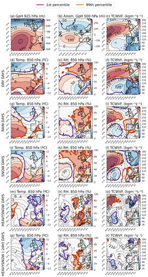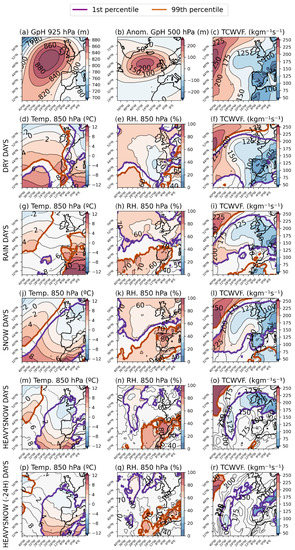For the cyclonic CWT: (a) Centroid map of the GpH at 925 hPa. (b) Composite map of 796 GpH anomalies at 500 hPa. (c) Composite map of the TCWVF. From the second row onwards, left column represents the composite map of temperature at 850 hPa, central column the relative humidity at 850 hPa and right column the TCWVF for different situations: in (d–f) days with less than 0.5 mm of precipitation, in (g–i) days with >0.5 mm of rain, in (j–l) days with >0.5 mm of snow, in (m–o) heavy snow days (>30mm) and in (p–r) the previous day to the heavy snow days. In (d–r) the areas containing values statistically significant below 1st percentile (above 99th percentile) are delineated with purple (orange) coloured contour markers. Colours inside these areas represent the values of each variable, increasing from blue to red.