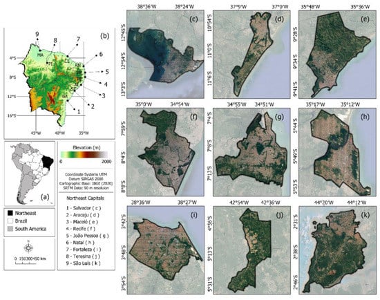 Location of the study area, with emphasis on the nine capitals and the elevation (m) of the NEB. Legend: (a) Brazil, (b) elevation in Northeast region, (c) Salvador, (d) Aracaju, (e) Maceió, (f) Recife, (g) João Pessoa, (h) Natal, (i) Fortaleza, (j) Teresina and (k) São Luís.