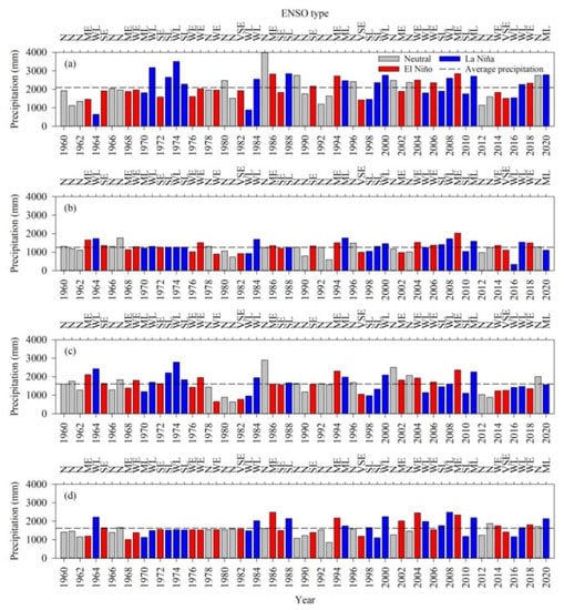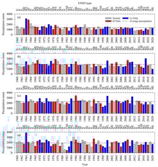 Annual rainfall distribution (mm/year) in ENEB capitals—Aracaju (a), Maceió (b), Recife (c), and João Pessoa (d). El Niño, La Niña, Neutral, and their intensities based on the Oceanic Niño Index (ONI): N: Neutral, WE: weak El Niño; ME: moderate El Niño; SE: strong El Niño; VSE: very strong El Niño; WL: weak La Niña; ML: moderate La Niña; and SL: strong La Niña. The colors in the bars are Neutral in grey, La Niña in blue, and El Niño in red, and the dashed line represents average rainfall for the period 1960–2020.