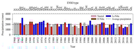Annual rainfall distribution (mm/year) in the SNEB capital—Salvador. El Niño, La Niña, Neutral, and their intensities based on the Oceanic Niño Index (ONI): N: Neutral, WE: weak El Niño; ME: moderate El Niño; SE: strong El Niño; VSE: very strong El Niño; WL: weak La Niña; ML: moderate La Niña; and SL: strong La Niña. The colors in the bars are Neutral in grey, La Niña in blue, and El Niño in red, and the dashed line represents average rainfall for the period 1960–2020.