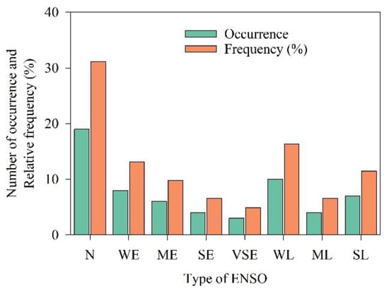 The occurrence of ENSO intensities in NEB capitals from 1960 to 2020. Note: Neutral (N), weak El Niño (WE), moderate El Niño (ME), strong El Niño (SE), very strong El Niño (VSE), weak La Niña (WL), moderate La Niña (ML), and strong La Niña (SL).