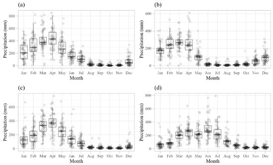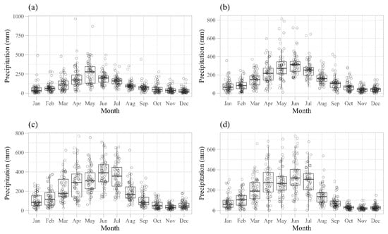 Monthly rainfall boxplot (mm) in NNEB—São Luís (a), Teresina (b), Fortaleza (c), and Natal (d) in the period from 1960 to 2020.