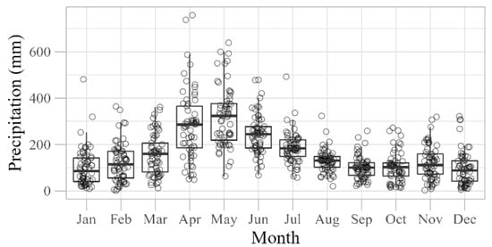 In Maceió (Figure 6b), the highest (lowest) median occurred in June (November) with a value of 312.3 mm (40.6 mm), as well as the lowest IQR (36.2 mm); on the contrary, in May (136.3 mm). Between April and July, there was a greater dispersion of data (outliers); on the contrary, in the period between August and December, with a decrease in this dispersion. The seasonality of rainfall in Maceió is due to the action of multiscale meteorological systems, for example, HLCV, SASH, EWD, TWD, and the circulation of sea/land and lagoon breezes [,,,]. Furthermore, the influence of the urbanization process and changes in land use and occupation cannot be ruled out, particularly since the 1990s, as recently identified by Correia Filho et al. [] and Oliveira Júnior et al. [].