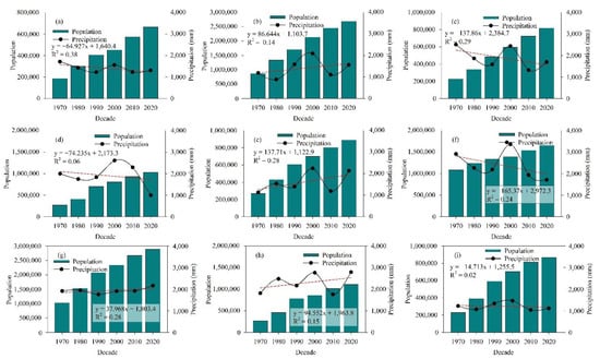 We are referring for the data of 9 stations for rainfall and population evaluation in various cities of NEB according to the spatial distribution of Figure 1 and Table 2. The stations belonging to the hydrometeorological network of ANA—Agência Nacional das Águas (ANA, 2021) are obtained via the HidroWeb platform at the following electronic address: http://www.ana.gov.br, accessed on 8 August 2022. The period comprises the years 1960 to 2020.