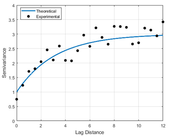 The function represents the number of pairs of measurement separated by distance within the interval [23]. A theoretical variogram was then developed by fitting a model to the experimental semivariogram [22,24,34]. The process was repeated for every point in the grid. An example of the experimental and theoretical variogram is shown in Figure 2.