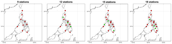 Distribution of variable GNSS receiver stations used. Stations in green indicate the additional stations for that parameter. 9 stations include PBAS, PGEN, PILC, PIMO, PLEG, PPPC, PTAC, PTUG and PZAM. 12 stations include the 9 stations plus PMAS, PSUR and PURD. 15 stations include the 12 stations plus PDAV, PMOG and PNDO. 18 stations include all receiver stations initially considered for this study based on Figure 1.